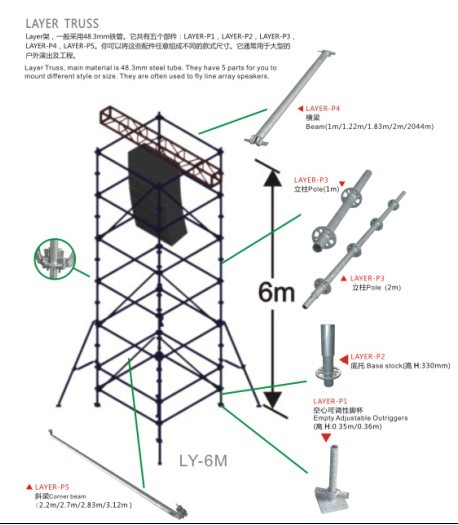 The line array layer truss,also named stage trusses , layer truss , line array hanger , scaffolding ,be applied to hang large-scale line array speaker, The advantage of using layer truss as a light truss or line array scaffold is that it can lift more weight and is relatively more stable.